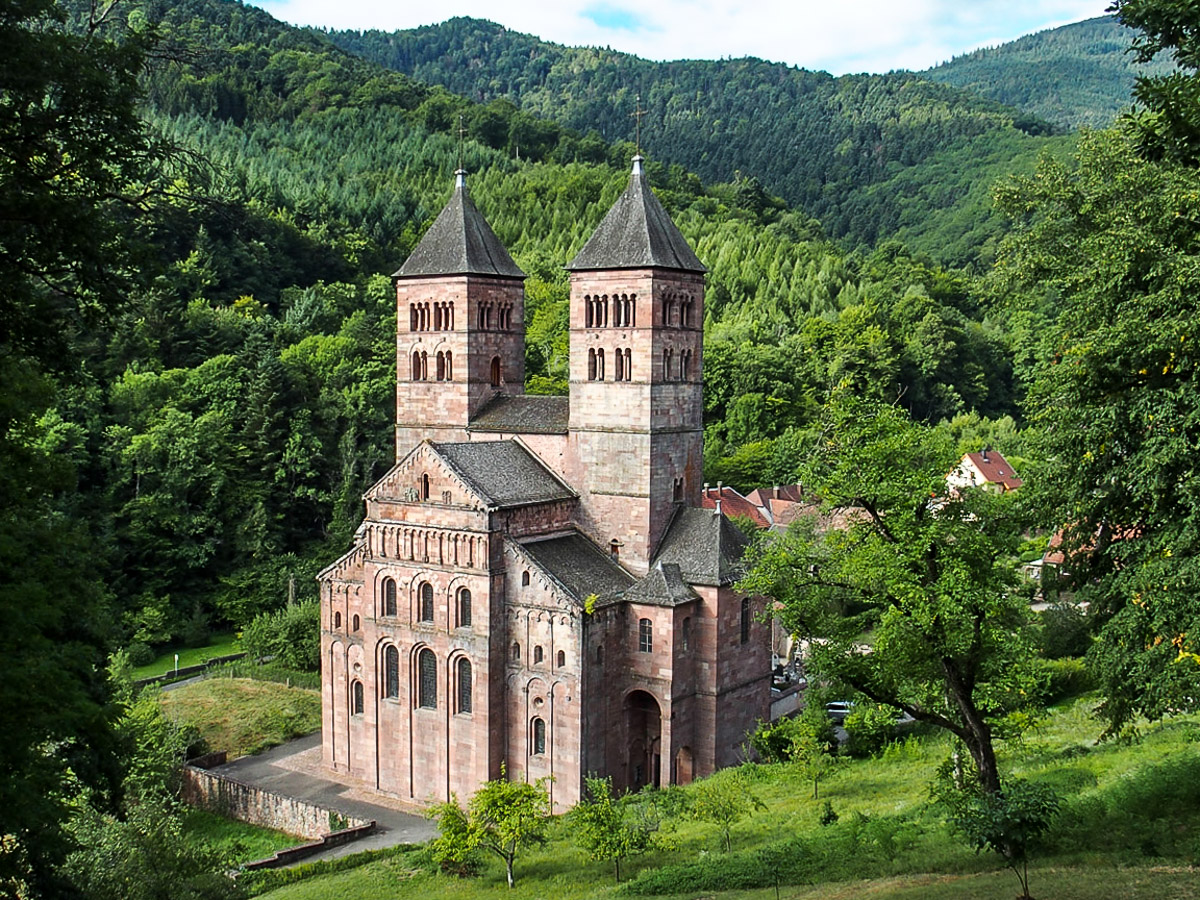 Nous partirons de l’abbaye de Murbach (altitude 430 m), fondée en 728, nichée au fond de la vallée de Guebwiller dans un endroit paisible et propice au recueillement, du moins à l’époque de sa fondation. De cette ancienne et naguère très puissante abbaye bénédictine, il ne reste que le chevet et le chœur de l’église. Pourtant, cette abbatiale Saint-Léger garde une majesté et un charme indéniables.